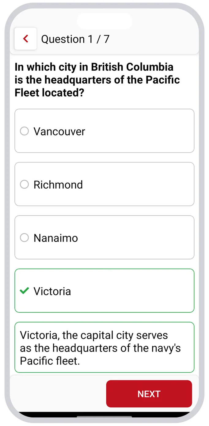Based on "Discover Canada: The Rights and Responsibilities of Citizenship", Application helps you prepare for the citizenship test. Also allows you to select an exam simulation an unlimited number of times. You can also study for each section, highlighting important information. Each question in the test has an explanation which allows you to learn from your mistakes.