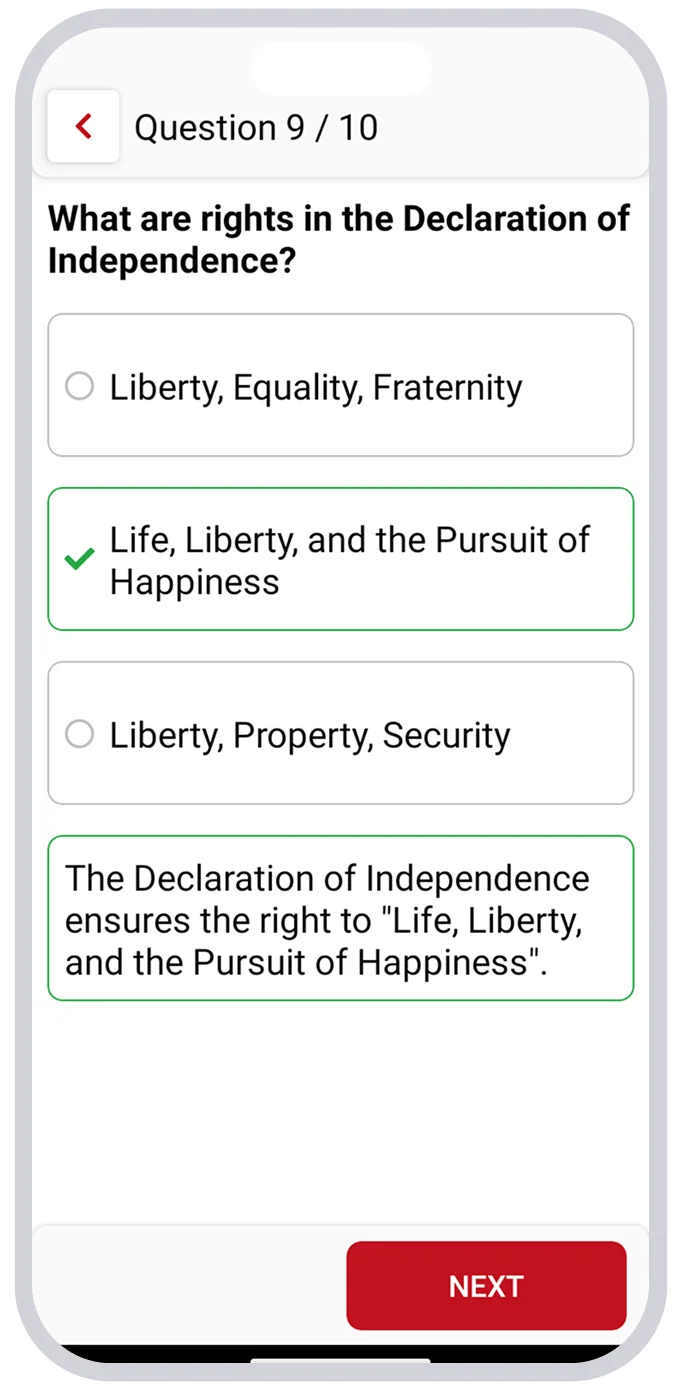 Based on the official study material "The 100 Civics (History and Government) Questions and Answers (2008 version) for the Naturalization Test", the application helps you prepare for the civics test. It provides unlimited access to exam simulations and also allows you to study paragraph by paragraph. Additionally, each test question comes with an explanation to help you learn from your mistakes.